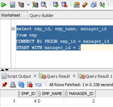 Lets write a query using CONNECT BY. CONNECT BY in general describes the relationship between parent row and child row in a hierarchy.